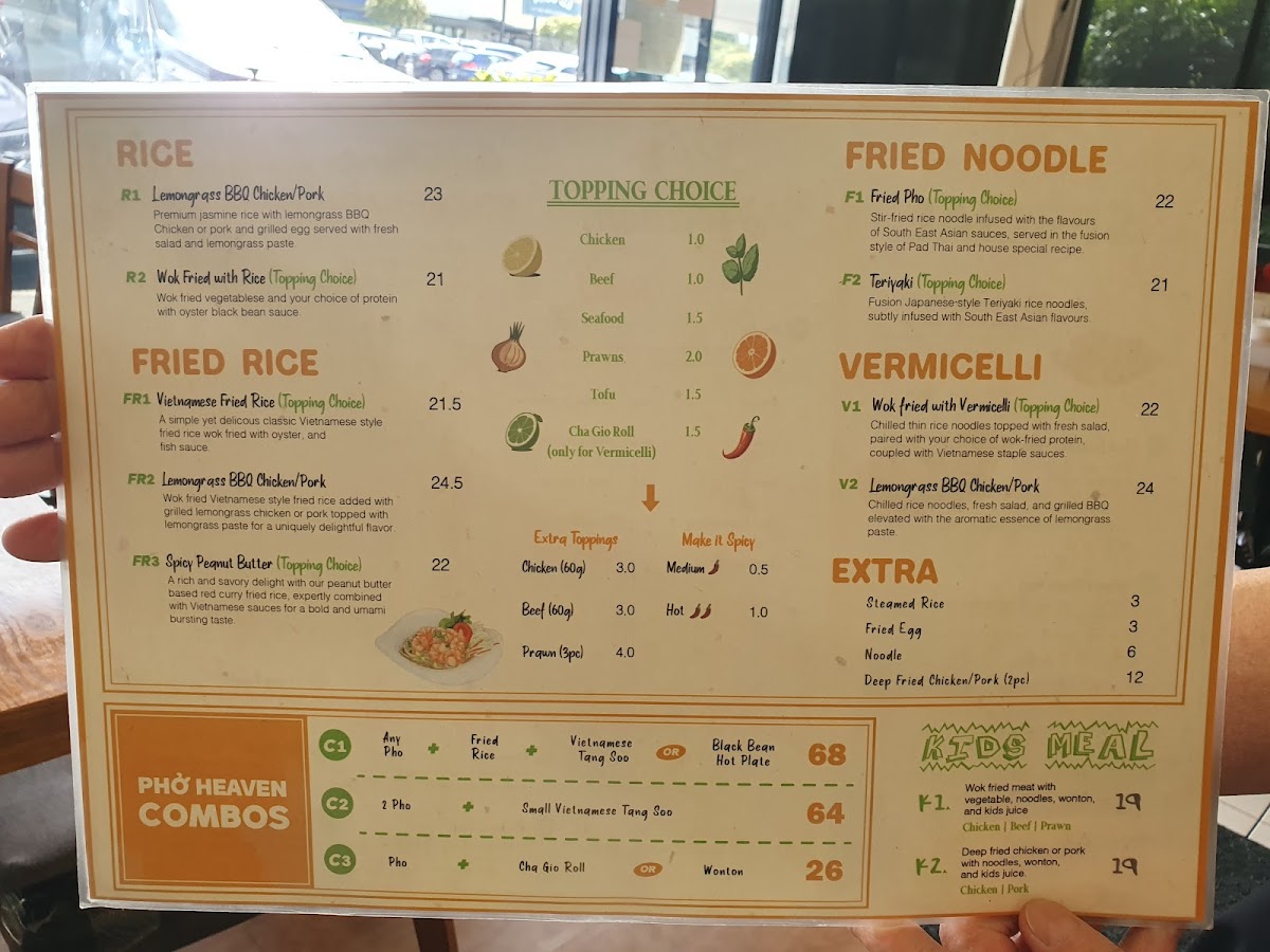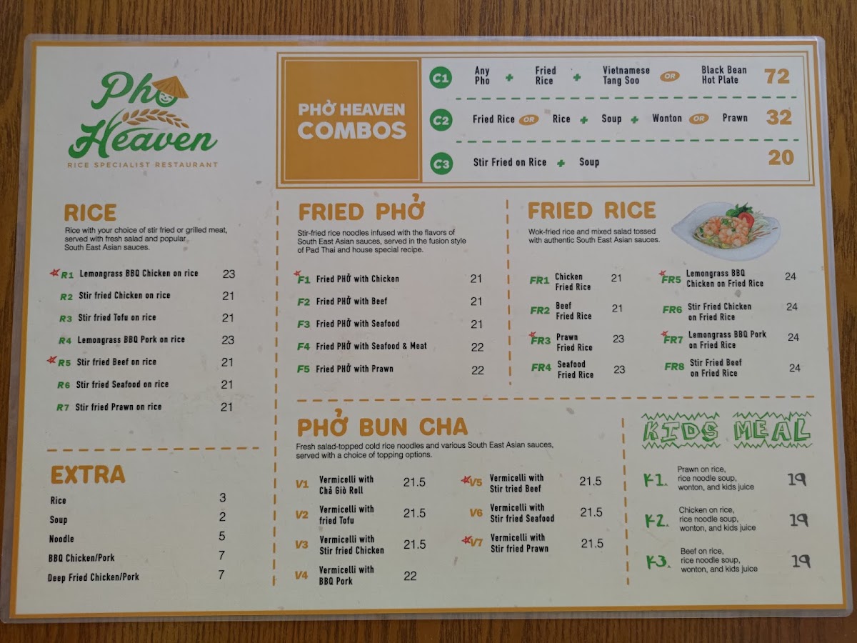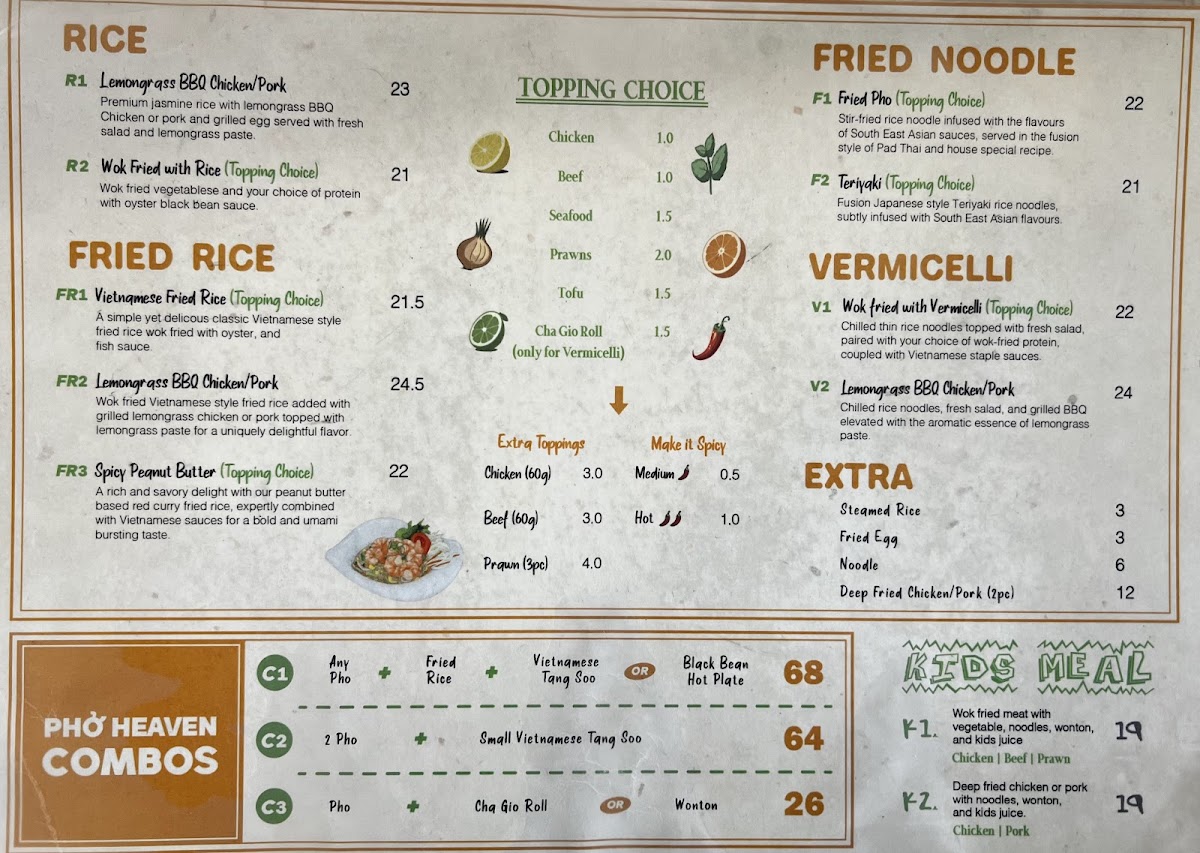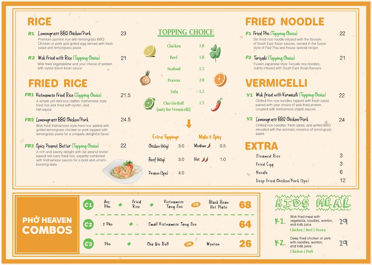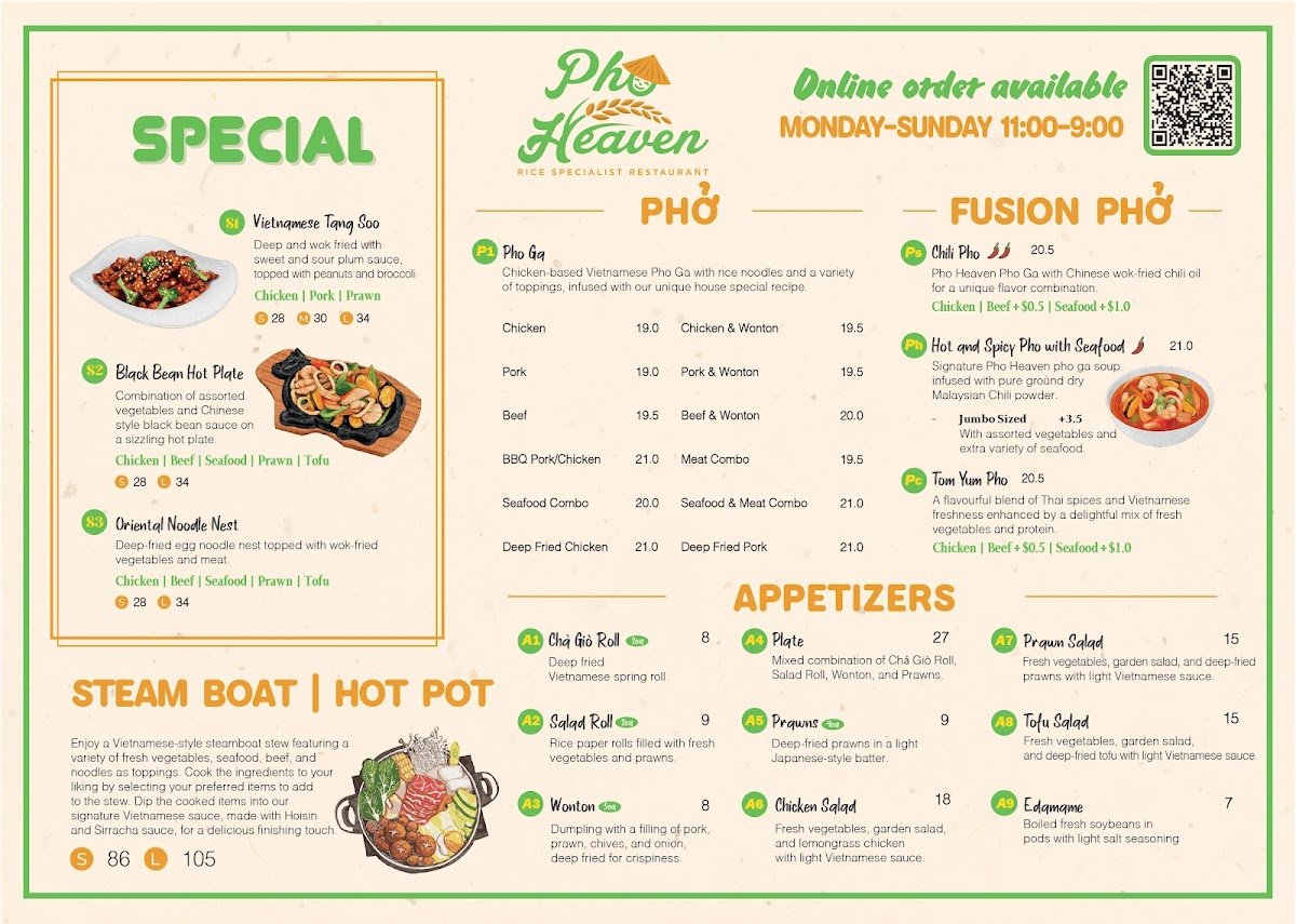 Pho Heaven Restaurant offers a diverse and flavorful menu that caters to a wide range of tastes. The Rice Noodle Soup section features dishes like Pho Ga for P16, Pho With Deep Fried Chicken at P15, and a unique Vietnamese-Korean Fusion option, Jjamppong Tom Yum Pho, priced at P14. For a spicy kick, the Chili Pho With is also available. Moving to the Fried Rice Noodle category, you'll find Fried Pho With (F1). The Vermicelli menu includes options like Vermicelli With (V1). Specialty dishes such as the Pho Heaven Special, with choices like Vietnamese Black Bean and Vietnamese Tang Soo, add an exciting twist. The appetizers include delightful options like the Plate Prawns, Chicken Salad, and the crispy Cha Gio Roll. For the little ones, there is a Kids Meal to satisfy their cravings. The Rice section features tasty meals like Wok Fried With Rice (R2) and the flavorful Lemongrass BBQ On Rice (R1). In the Fried Rice menu, try the rich Spicy Peanut Butter Fried Rice (FR3) or the savory Lemongrass BBQ Chicken On Fried Rice (FR2), along with the classic Fried Rice With (FR1). To round off your meal, Pho Heaven offers extras such as Rice, Noodles & Soup, and Lemongrass BBQ Chicken or Pork to customize your dish. The beverage selection includes refreshing Bundaberg, water, and canned drinks, providing perfect pairings for every meal.