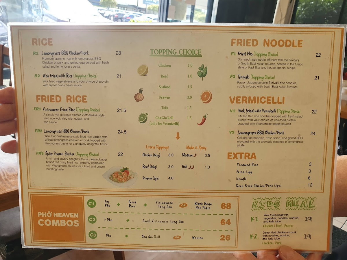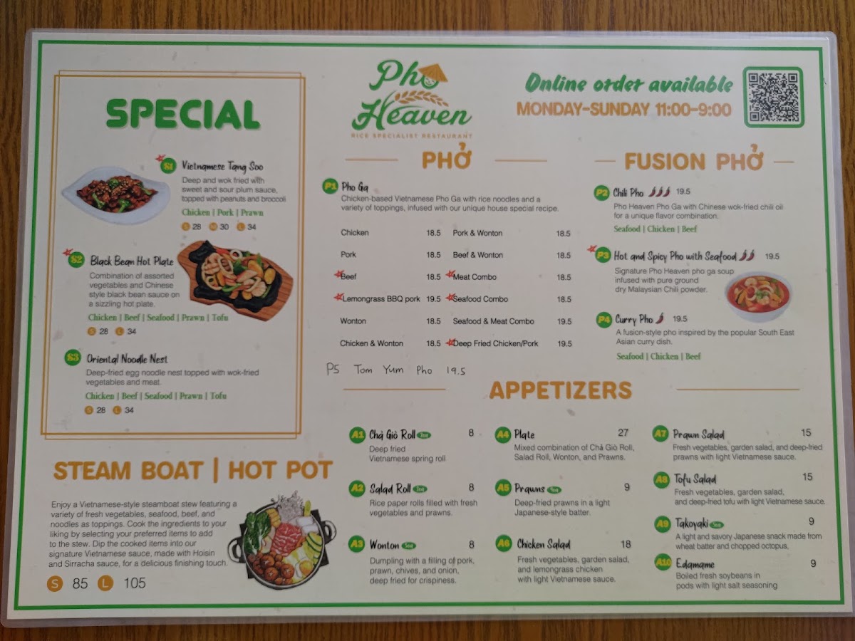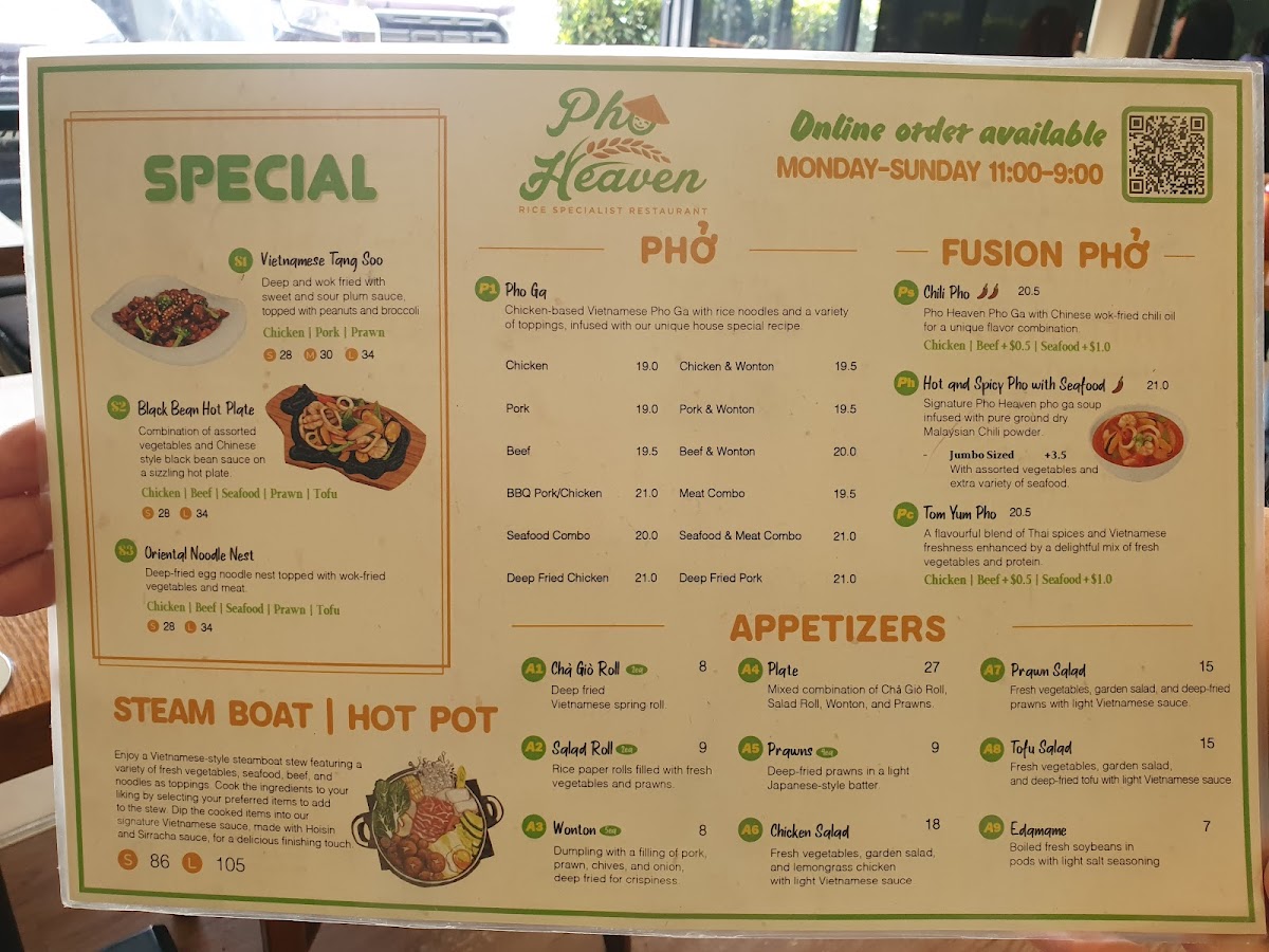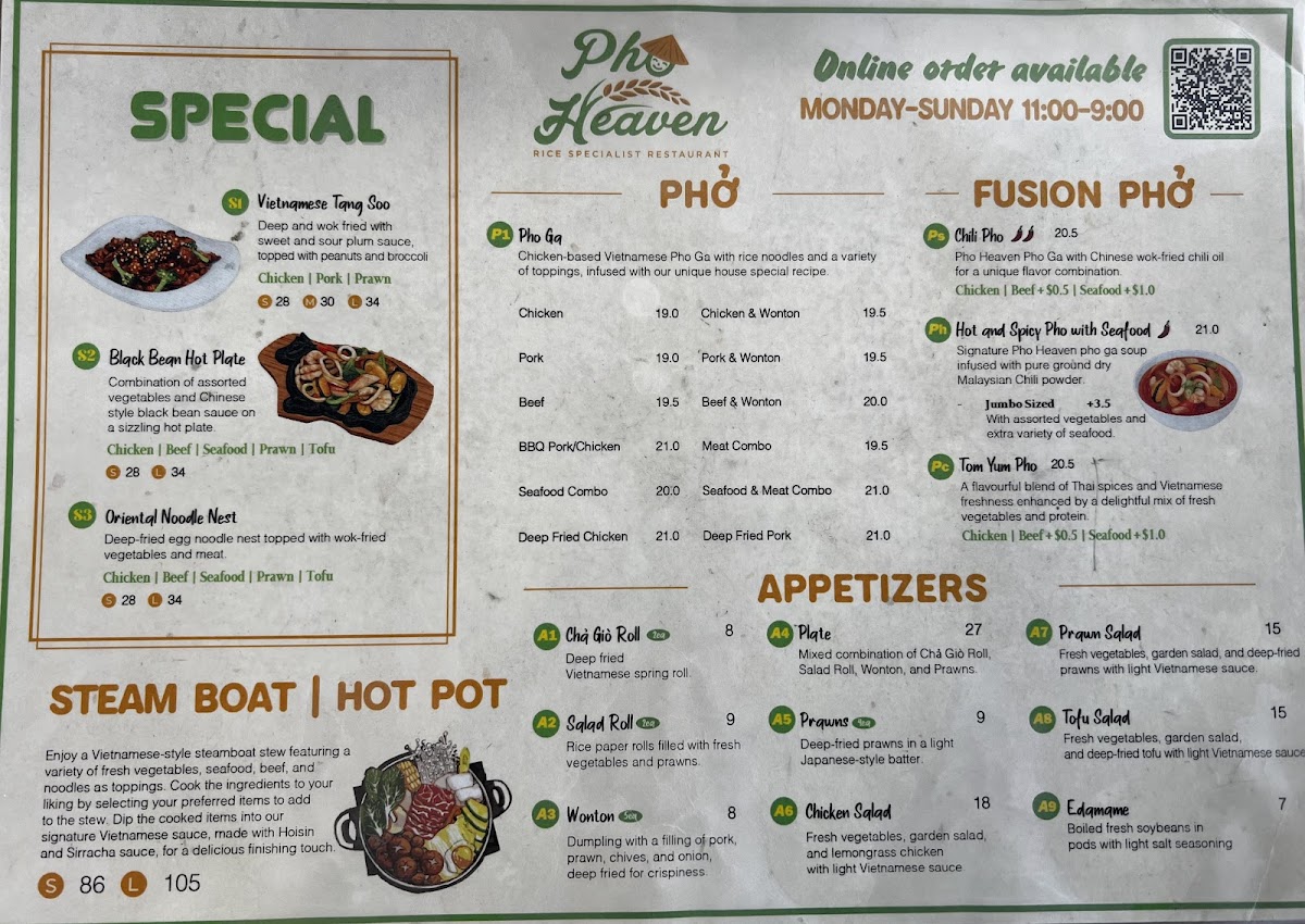 Pho Heaven Restaurant offers a diverse and flavorful menu that caters to a wide range of tastes. The Rice Noodle Soup section features dishes like Pho Ga for P16, Pho With Deep Fried Chicken at P15, and a unique Vietnamese-Korean Fusion option, Jjamppong Tom Yum Pho, priced at P14. For a spicy kick, the Chili Pho With is also available. Moving to the Fried Rice Noodle category, you'll find Fried Pho With (F1). The Vermicelli menu includes options like Vermicelli With (V1). Specialty dishes such as the Pho Heaven Special, with choices like Vietnamese Black Bean and Vietnamese Tang Soo, add an exciting twist. The appetizers include delightful options like the Plate Prawns, Chicken Salad, and the crispy Cha Gio Roll. For the little ones, there is a Kids Meal to satisfy their cravings. The Rice section features tasty meals like Wok Fried With Rice (R2) and the flavorful Lemongrass BBQ On Rice (R1). In the Fried Rice menu, try the rich Spicy Peanut Butter Fried Rice (FR3) or the savory Lemongrass BBQ Chicken On Fried Rice (FR2), along with the classic Fried Rice With (FR1). To round off your meal, Pho Heaven offers extras such as Rice, Noodles & Soup, and Lemongrass BBQ Chicken or Pork to customize your dish. The beverage selection includes refreshing Bundaberg, water, and canned drinks, providing perfect pairings for every meal.